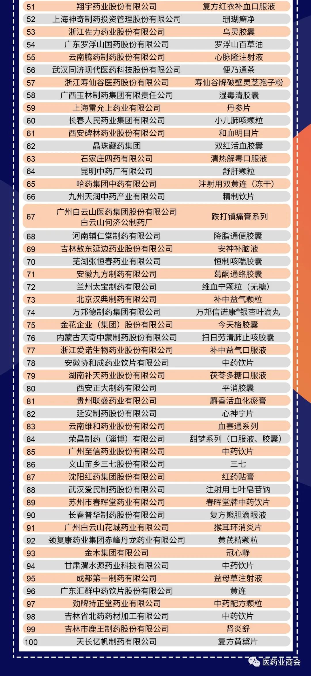 全国工商联医药业商会近日发布“2019年度中华民族医药百强品牌企业”榜单,扬子江药业及其产品蓝芩口服液、修正药业及其产品肺宁颗粒、云南白药集团及其云南白药系列产品位列前三甲。